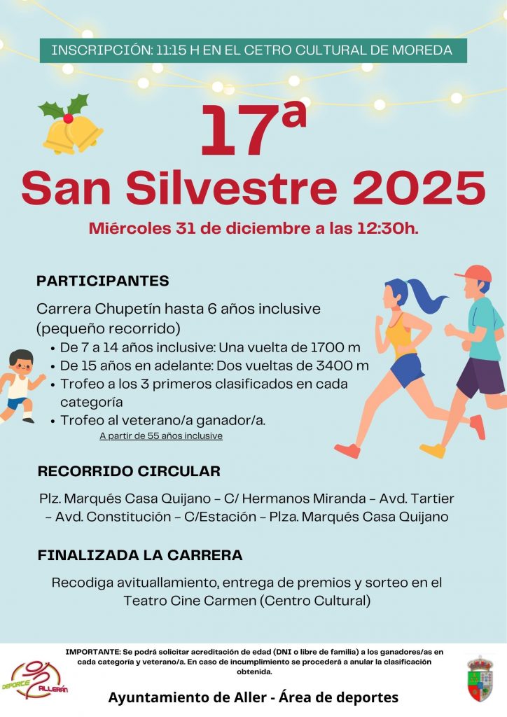 El concejo de Aller despedirá el año con la celebración de la 17ª San Silvestre de Aller, una cita deportiva ya tradicional que tendrá lugar el miércoles 31 de diciembre, organizada por el Área de Deportes del Ayuntamiento de Aller con la colaboración de Protección Civil, Policía Local y numerosos establecimientos comerciales del concejo.