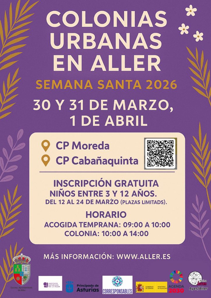 El programa “Colonias Urbanas en Aller. Semana Santa 2026” se desarrollará en dos sedes del concejo: el colegio de Cabañaquinta y el colegio de Moreda, durante los días 30 y 31 de marzo y 1 de abril.