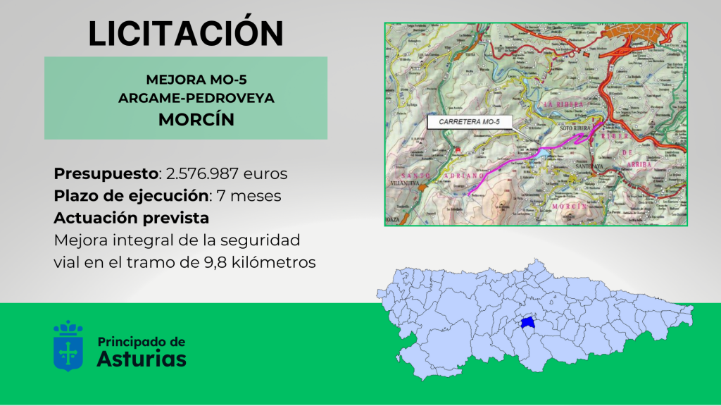 La Consejería de Movilidad, Medio Ambiente y Gestión de Emergencias ha sacado a licitación, por un importe de 2.576.987 euros, las obras de renovación integral de la carretera MO-5, que conecta Argame con Pedroveya, en el concejo de Morcín. La actuación cuenta con un plazo de ejecución de siete meses y permitirá mejorar la seguridad vial a lo largo de un tramo de 9,8 kilómetros. Las empresas interesadas podrán presentar sus ofertas hasta el 26 de enero.