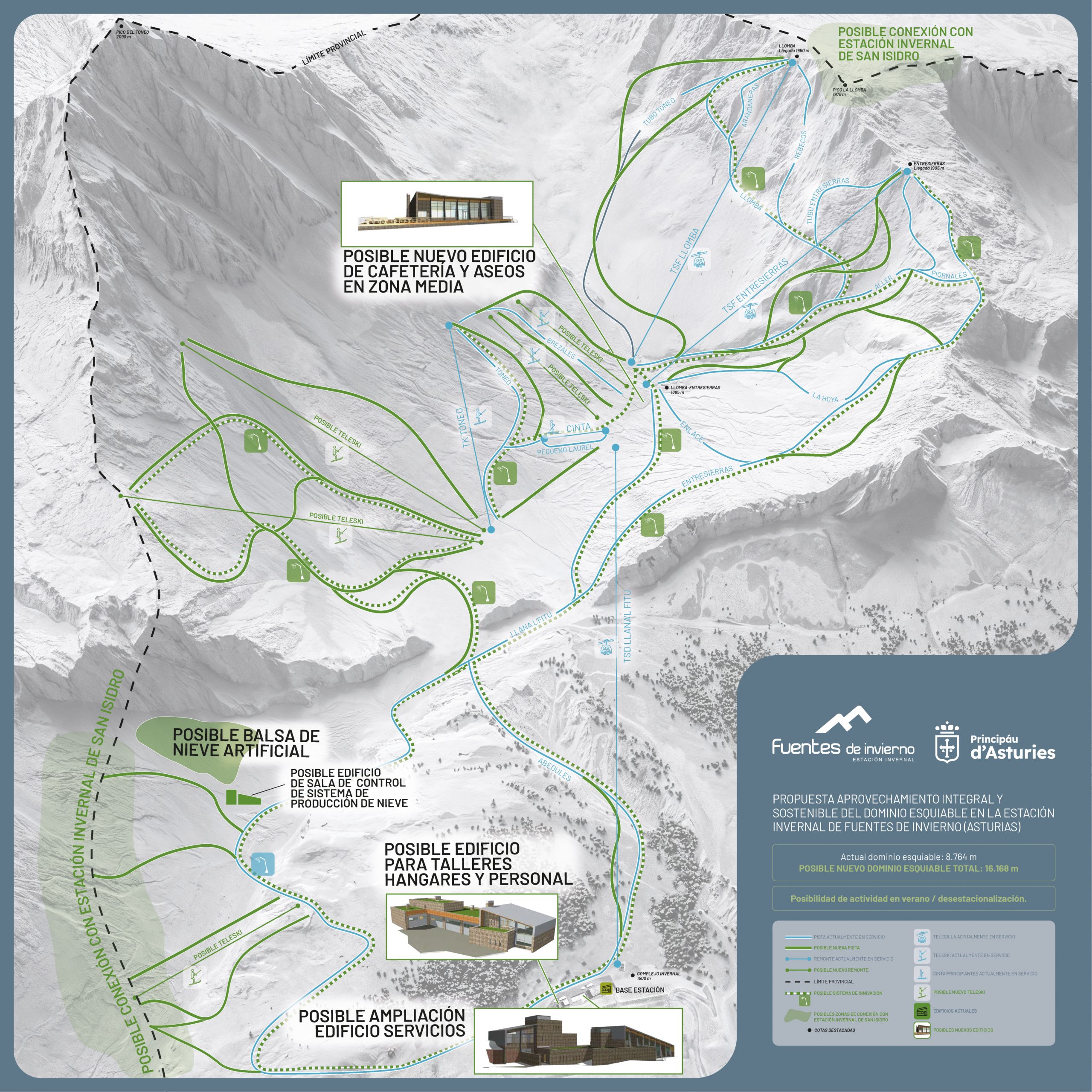 El proyecto plantea además la posible instalación de cinco nuevos telesquíes, con el objetivo de descongestionar las zonas para debutantes, mejorar la movilidad interna y facilitar una futura conexión con la estación leonesa de San Isidro.