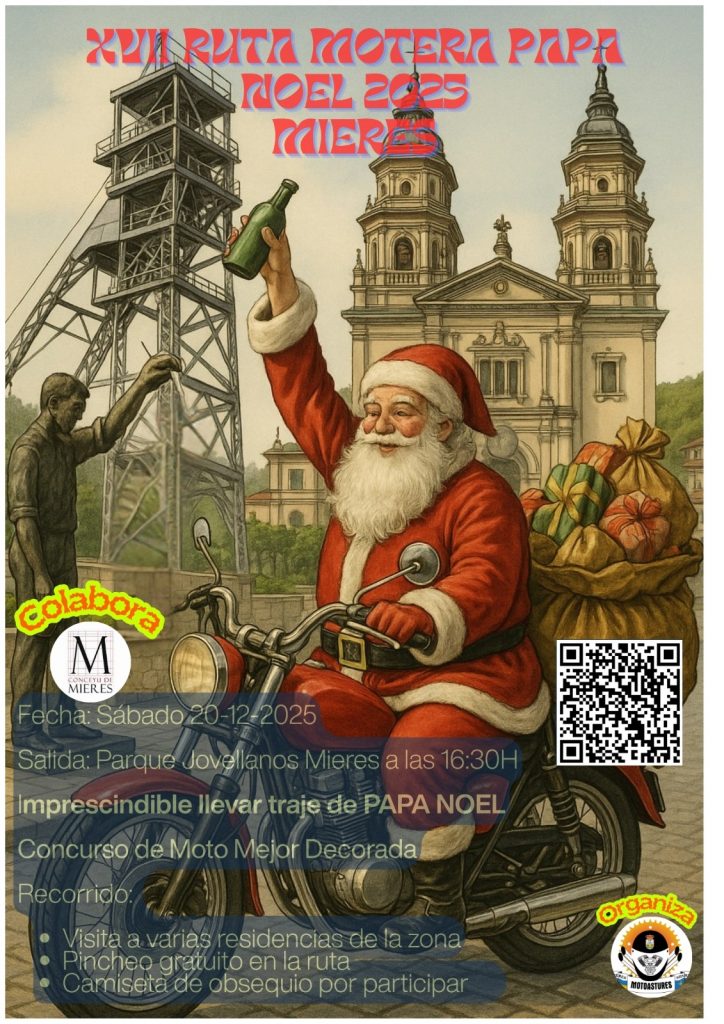 El sábado 20 de diciembre, Mieres volverá a llenarse de espíritu navideño y rugidos de motores con la celebración de la XVII Ruta Motera Papá Noel, organizada por Motoastures con la colaboración del Ayuntamiento de Mieres. La salida será desde el Parque Jovellanos a las 16:30 h.
