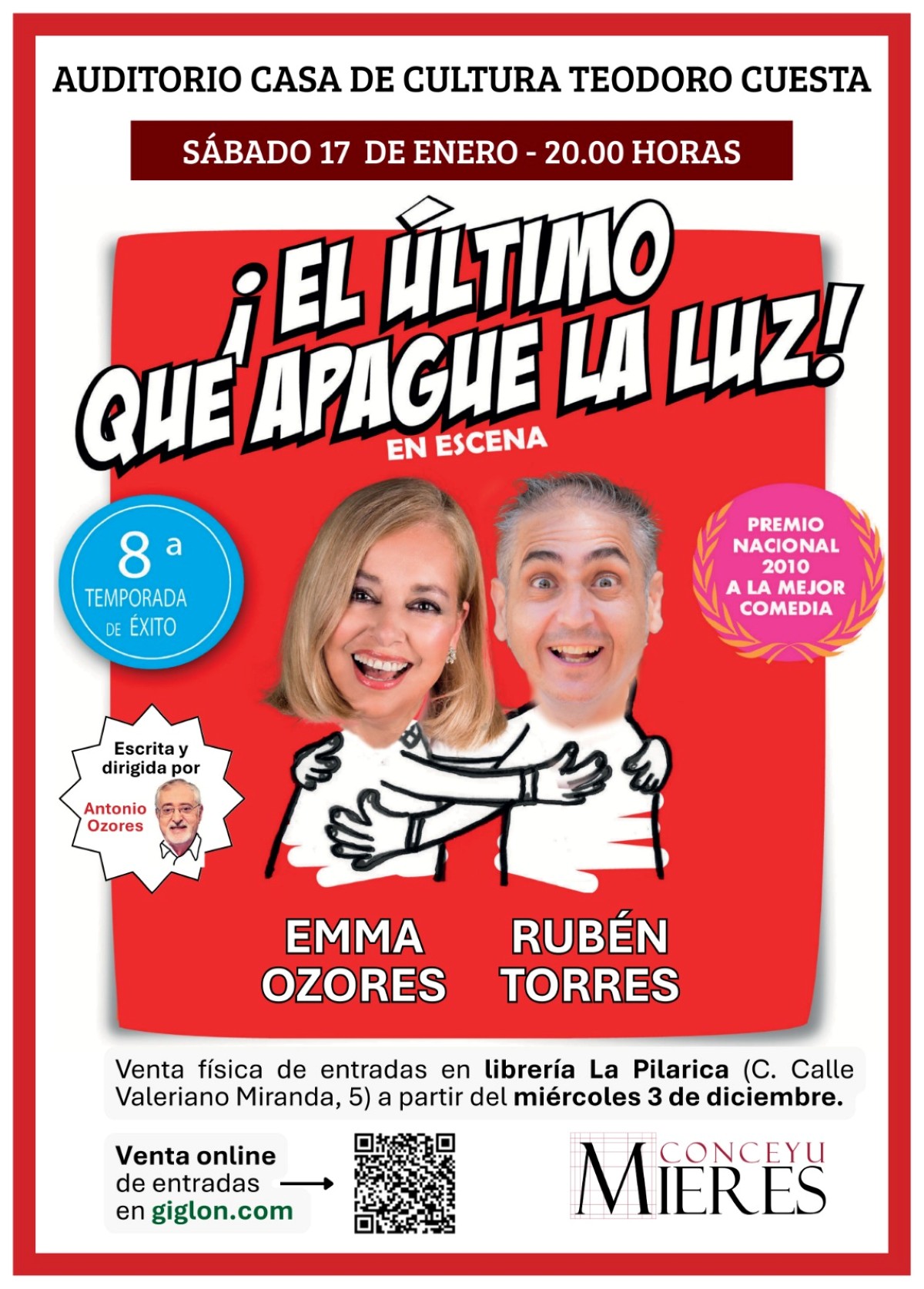El Auditoriu Teodoro Cuesta de Mieres acogerá el próximo sábado 17 de enero, a las 20:00 horas, la representación de la comedia “¡El último que apague la luz!”, protagonizada por Emma Ozores y Rubén Torres. Las entradas tienen un precio de 10 euros y ya están a la venta tanto online como de forma presencial en la Librería La Pilarica, en Mieres.