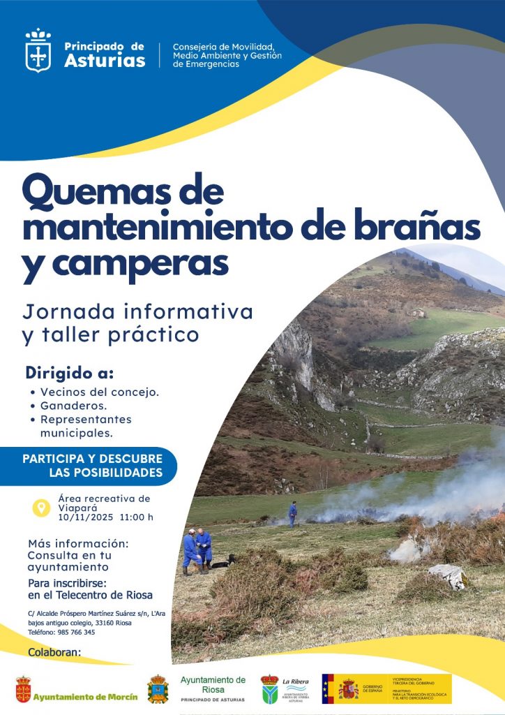 El próximo lunes, 10 de noviembre, el área recreativa de Viapará (Riosa) será el escenario de una jornada informativa y taller práctico sobre las quemas de mantenimiento de brañas y camperas, una práctica tradicional que, realizada de forma controlada, contribuye al cuidado del paisaje y la prevención de incendios.