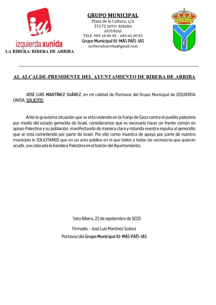 El Grupo Municipal de Izquierda Unida–Más País–IAS en el Ayuntamiento de Ribera de Arriba ha registrado una solicitud dirigida al alcalde del concejo para que, en un acto público abierto a la ciudadanía, se coloque la bandera palestina en el balcón del Consistorio como gesto simbólico de solidaridad con el pueblo palestino ante la grave situación que se vive en la franja de Gaza.