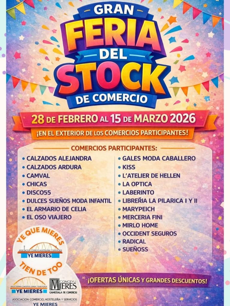 La Asociación Ye Mieres ha presentado la nueva edición de la Feria del Stock del Comercio, Hostelería y Servicios de Mieres, una cita que se celebrará del 28 de febrero al 15 de marzo y que llevará descuentos y oportunidades especiales al exterior de los establecimientos participantes.