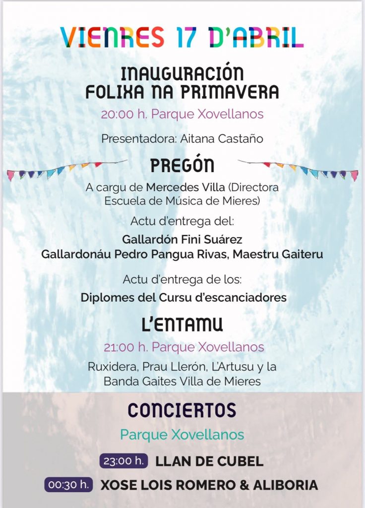 Con esta programación, la Folixa na Primavera refuerza su apuesta por combinar tradición, música y participación ciudadana, consolidándose como una de las citas culturales más destacadas del calendario festivo en Mieres.