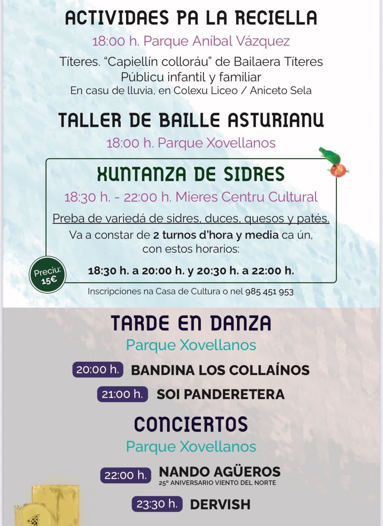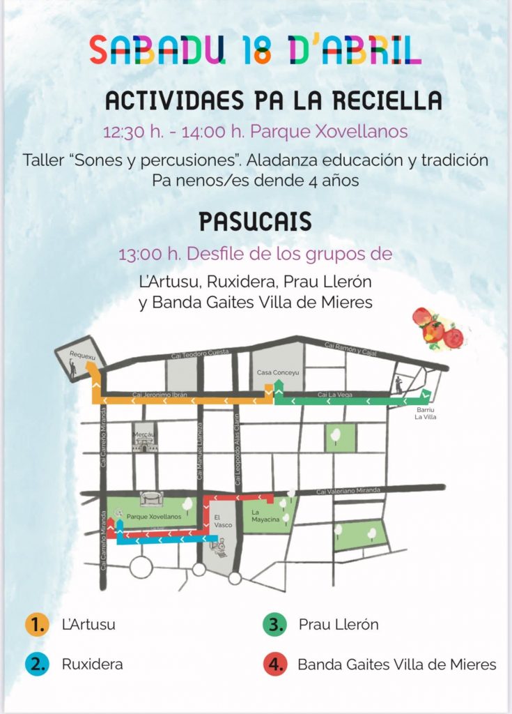 El sábado 18 de abril estará centrado en la participación popular y las actividades familiares. Durante la mañana, el Parque Xovellanos acogerá talleres infantiles y el desfile de grupos tradicionales, mientras que por la tarde se desarrollarán actividades como teatro de títeres, un taller de baile asturiano y la Xuntanza de Sidres en el Mieres Centru Cultural, con degustaciones organizadas en dos turnos.