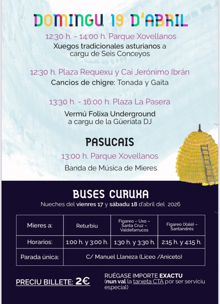 Además, durante las noches del viernes y sábado se habilitará un servicio especial de buses “Curuxa” para facilitar los desplazamientos desde distintos puntos del concejo.
