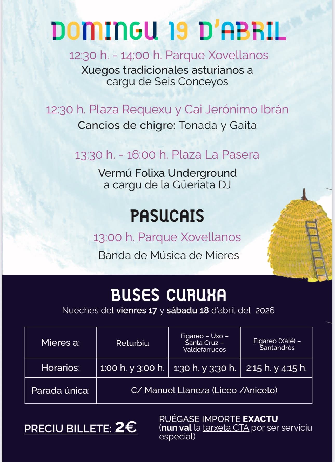 El domingo 19 de abril pondrá el broche final con actividades tradicionales como xuegos asturianos, música de chigre con tonada y gaita, y un vermú musical en la Plaza La Pasera, antes del desfile final a cargo de la Banda de Música de Mieres.