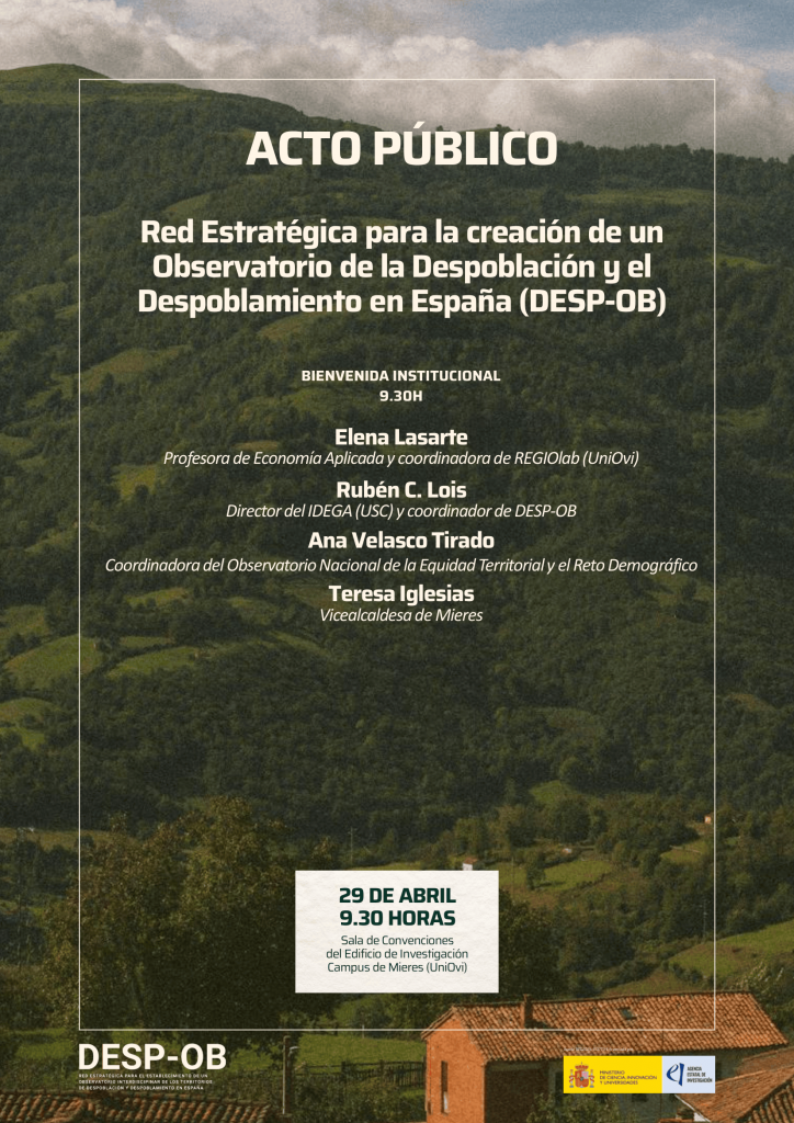 El encuentro arrancará el día 29 de abril a las 9:30 horas en la Sala de Convenciones del Edificio de Investigación, con una bienvenida institucional en la que participarán Elena Lasarte, profesora de Economía Aplicada y coordinadora de REGIOlab (UniOvi); Rubén C. Lois, catedrático de Geografía y coordinador de la red DESP-OB; Ana Velasco Tirado, coordinadora del Observatorio Nacional de la Equidad Territorial; y Teresa Iglesias, alcaldesa en funciones de Mieres.