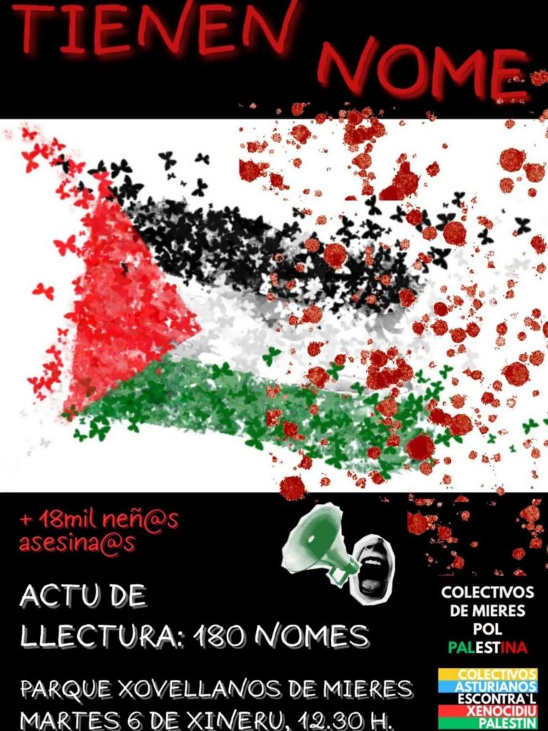 El Parque Jovellanos de Mieres será escenario el próximo martes 6 de enero, a las 12:30 horas, de un acto de lectura pública bajo el lema “Tienen nombre”, una iniciativa impulsada por colectivos de Mieres por Palestina, con el apoyo de organizaciones asturianas solidarias.