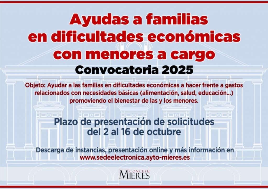 El Ayuntamiento de Mieres, a través del área de Derechos Sociales que dirige Teresa Iglesias, ha convocado un paquete de ayudas destinadas a familias con menores a cargo en situación de dificultad económica. Esta convocatoria, publicada hace unos días en el Boletín Oficial del Principado de Asturias (BOPA), cuenta con un presupuesto total de 200.000 euros y el plazo para presentar solicitudes estará abierto del 2 al 16 de octubre (10 días hábiles).