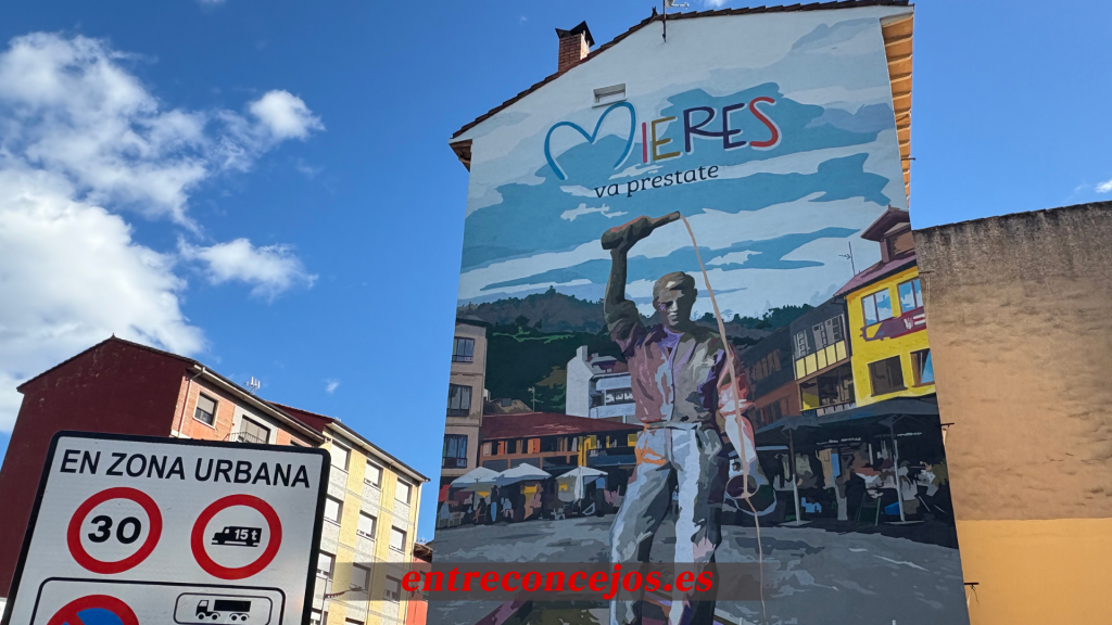 Mieres estrena imagen a su entrada norte con un nuevo gran mural que ya luce en la fachada de un edificio visible desde la autopista A-66. La obra, protagonizada por el escanciador de la Plaza de Requejo/Requexu y el lema “Mieres va prestate”, busca promocionar uno de los espacios más emblemáticos y sidreros del concejo, reconocible por su tradición y vitalidad.