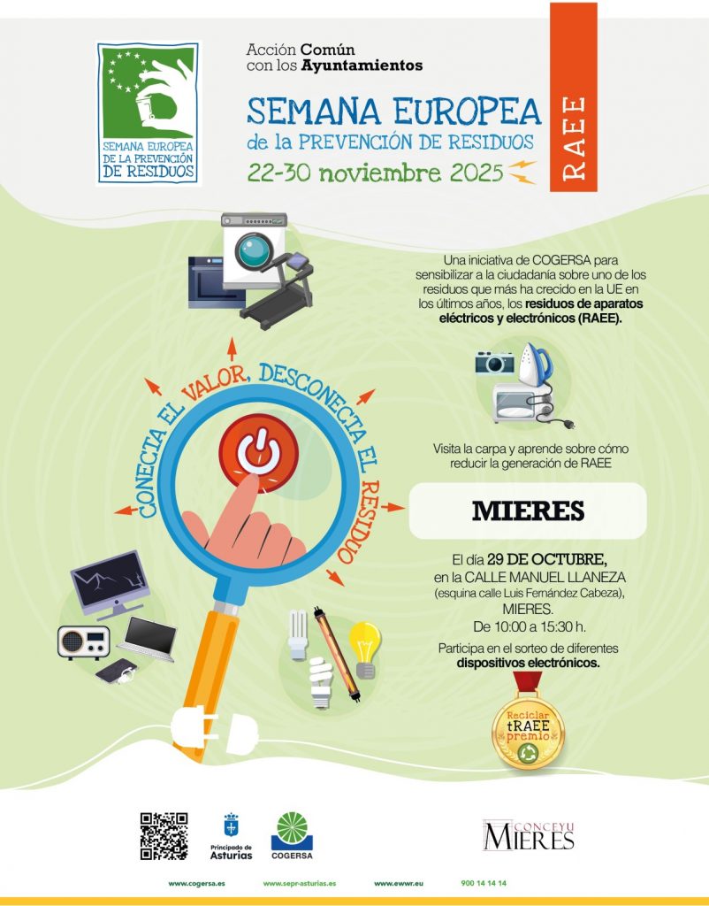 Del 22 al 30 de noviembre se celebra la Semana Europea de la Prevención de Residuos 2025 (SEPR), y el Ayuntamiento de Mieres, a través de la Concejalía de Medio Ambiente, participa un año más con una campaña de sensibilización ciudadana impulsada por COGERSA, centrada en uno de los residuos que más ha crecido en los últimos años en la Unión Europea: los RAEE (Residuos de Aparatos Eléctricos y Electrónicos).