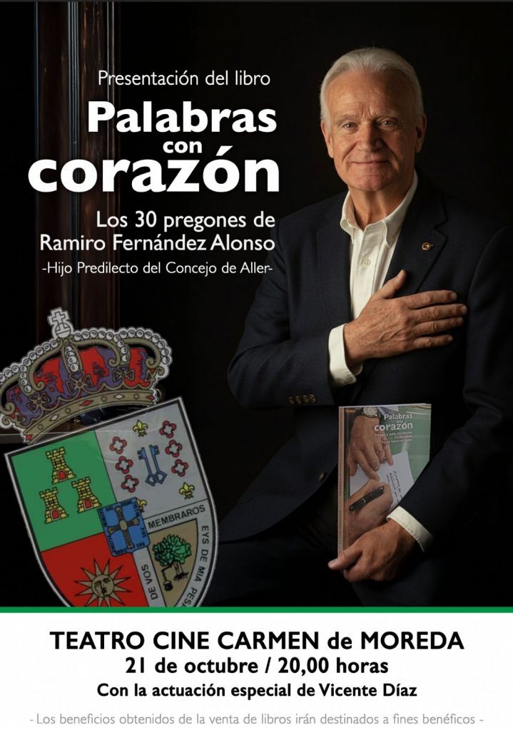 El próximo 21 de octubre, a las 20:00 horas, el Teatro Cine Carmen de Moreda acogerá un acto muy especial: la presentación del libro “Palabras con corazón”, escrito por Ramiro Fernández Alonso, Hijo Predilecto del Concejo de Aller y autor de más de tres décadas de pregones festivos.