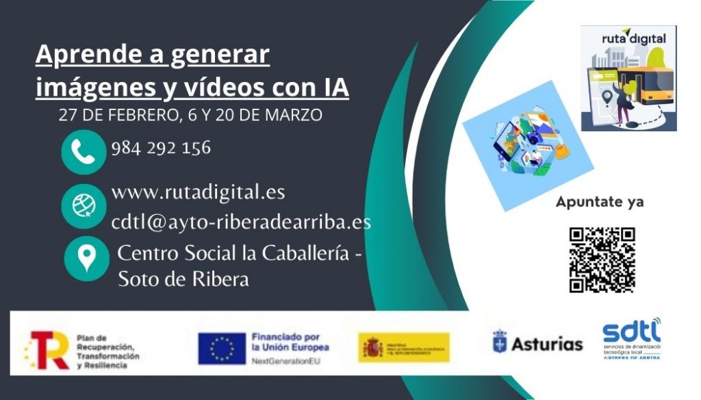 El SDTL de Ribera de Arriba, en colaboración con Ruta Digital, organiza el taller “Aprende a generar imágenes y vídeos con IA”, una propuesta formativa que se desarrollará los días 27 de febrero, 6 y 20 de marzo de 2026, en horario de 10:00 a 12:00 horas.