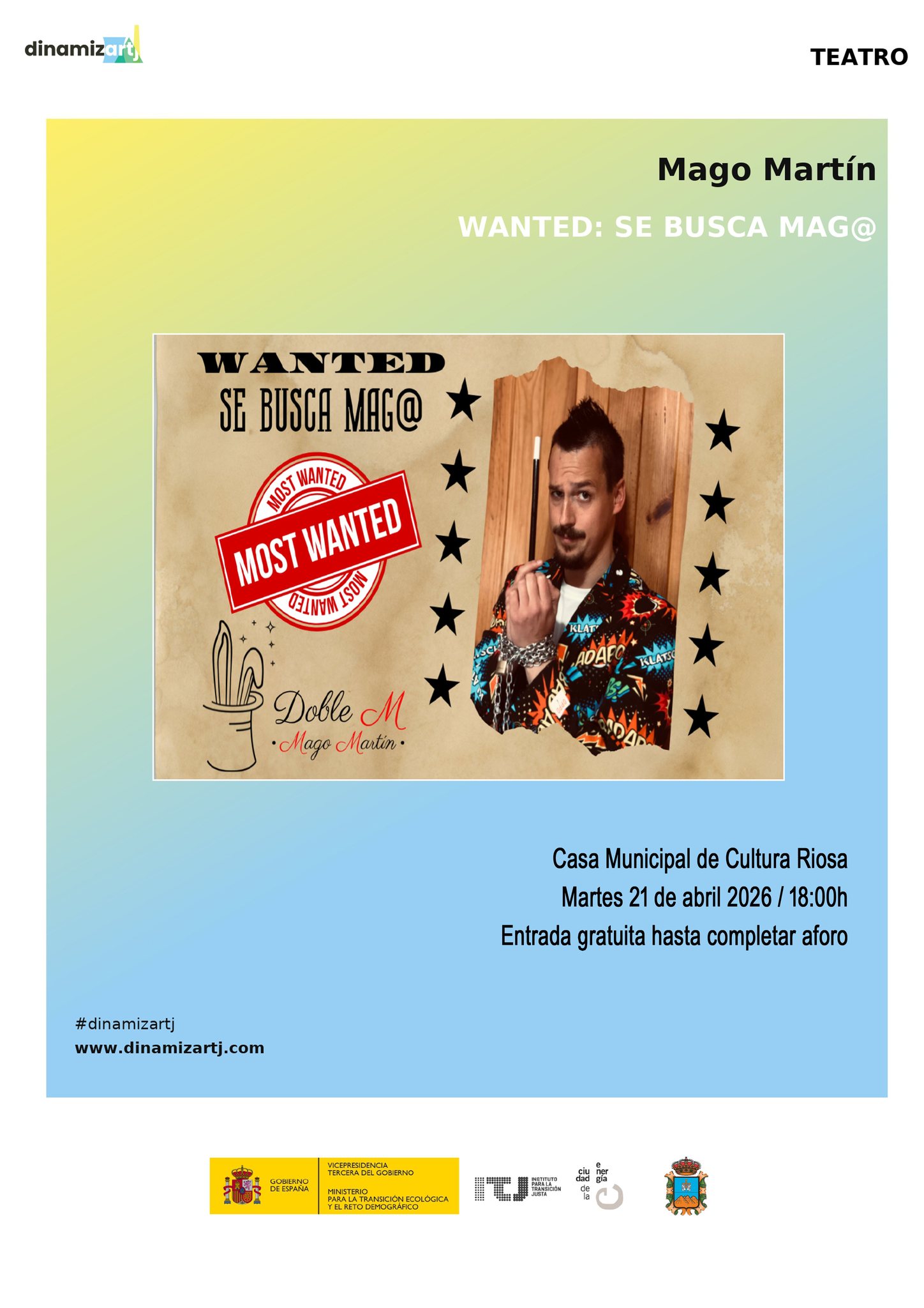 La Casa Municipal de Cultura de Riosa acoge hoy, martes 21 de abril, a las 18:00 horas, el espectáculo “Wanted: Se busca mag@”, protagonizado por el Mago Martín (Doble M), una propuesta escénica que combina magia, humor y participación del público.