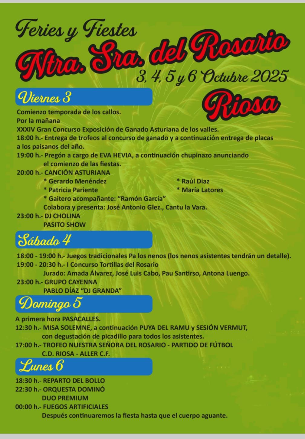 El concejo de Riosa se prepara para vivir con intensidad las Ferias y Fiestas en honor a Nuestra Señora del Rosario, que se celebrarán entre los días 3 y 6 de octubre de 2025, con un programa repleto de actividades tradicionales, música, gastronomía y cultura asturiana.