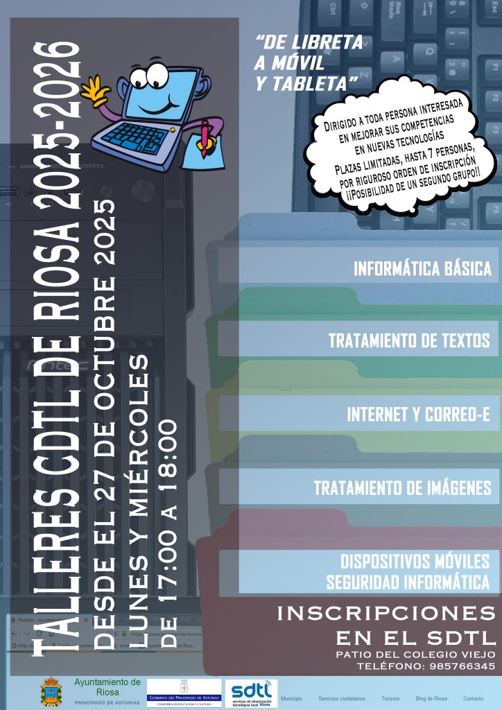 Bajo el lema «De libreta a móvil y tableta», la iniciativa busca reducir la brecha digital y acercar las herramientas informáticas a la ciudadanía. Los talleres se impartirán todos los lunes y miércoles, de 17:00 a 18:00 h, en el CDTL de Riosa (Patio del Colegio Viejo), a partir del 27 de octubre.