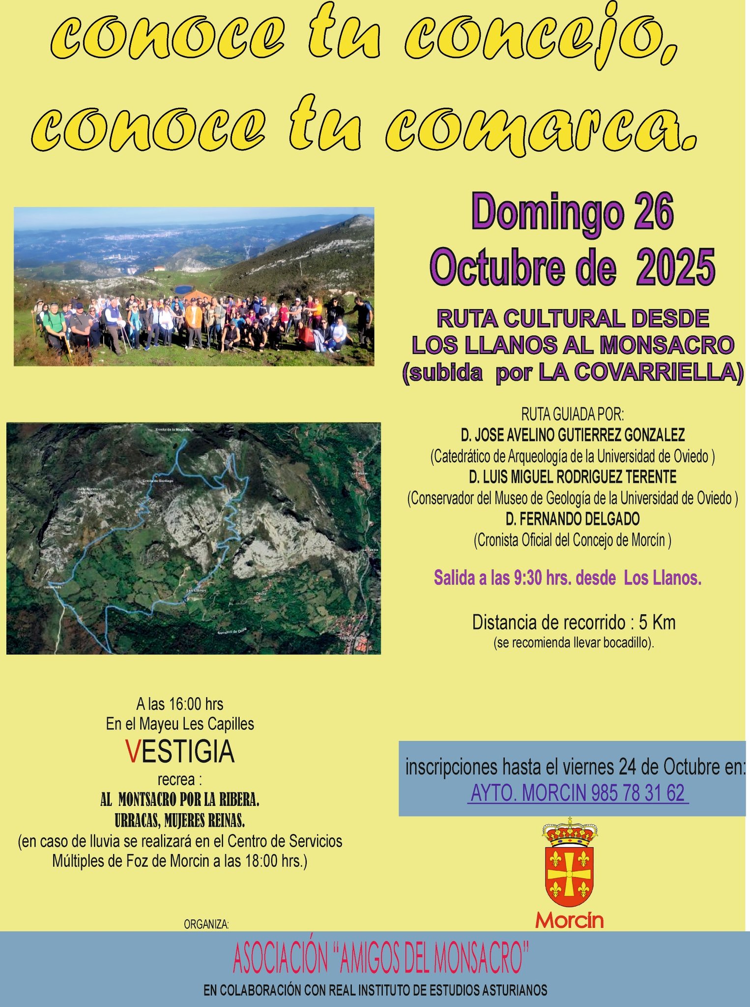 La Asociación Amigos del Monsacro, en colaboración con el Real Instituto de Estudios Asturianos (RIDEA) y el Ayuntamiento de Morcín, organiza una nueva edición de la actividad “Conoce tu concejo, conoce tu comarca”, que propone una inmersión en el paisaje, la historia y las leyendas del Monsacro.